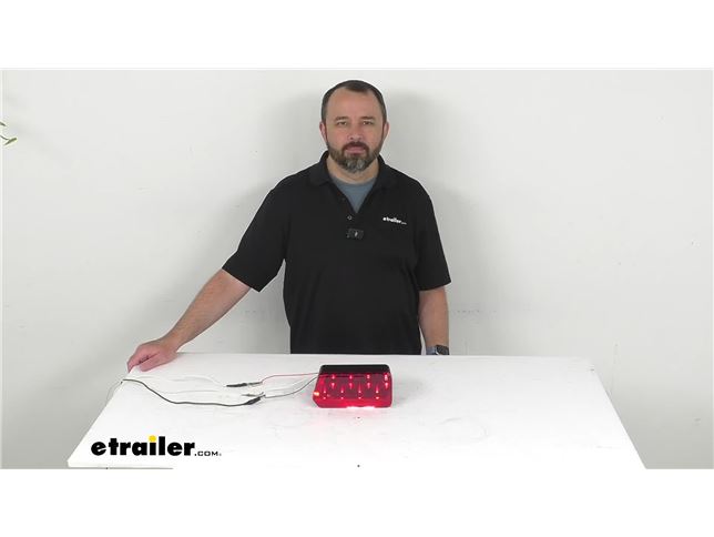 Hi everybody, Andy here with etrailer.com. Let's take a real quick look at this TecNiq driver's side contour eight function box style taillight. So this is gonna cover everything that you expect from a full rear trailer taillight. As you can see, I do have this plugged into my power supply already and I have the taillight function currently on, but I'm gonna go ahead and turn my studio lights off here and walk through the other functions. So taillight, brake light, and then turn signal. And then I'm just gonna back out here real quick just so you can see what this looks like from a distance.