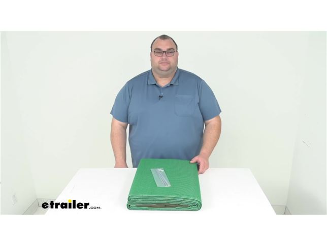 Hi, everyone, Steve here with etrailer.com. Today we're looking at this Camco Reversible RV Outdoor Rug with included stakes. Now, this is gonna be a nine-foot long by six-foot wide in a nice green color. Now, this leisure mat will give you a comfortable place to relax next to your RV, and it's also gonna include these stakes, like I mentioned, but it's gonna keep dirt from being tracked inside, grime, dust, that kind of stuff. It does fold out, obviously a lot bigger than this. I don't have space here today for that, but it folds out very nice.
