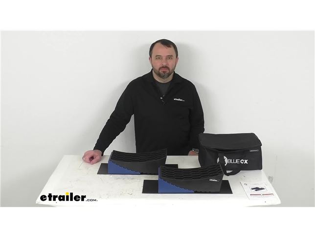 Hi, everybody. Andy here with etrailer.com. Let's take a look together at this Blue Ox leveling kit. Now this leveling kit is going to contain everything that you need to help stabilize your trailer or RV, whether you're at home or at the campsite. And this kit includes everything that you see here on my table before me. You're gonna get these two levelers and then two wheel chocks, and then these two anti-slip mats along with the storage bag instead of instructions.
